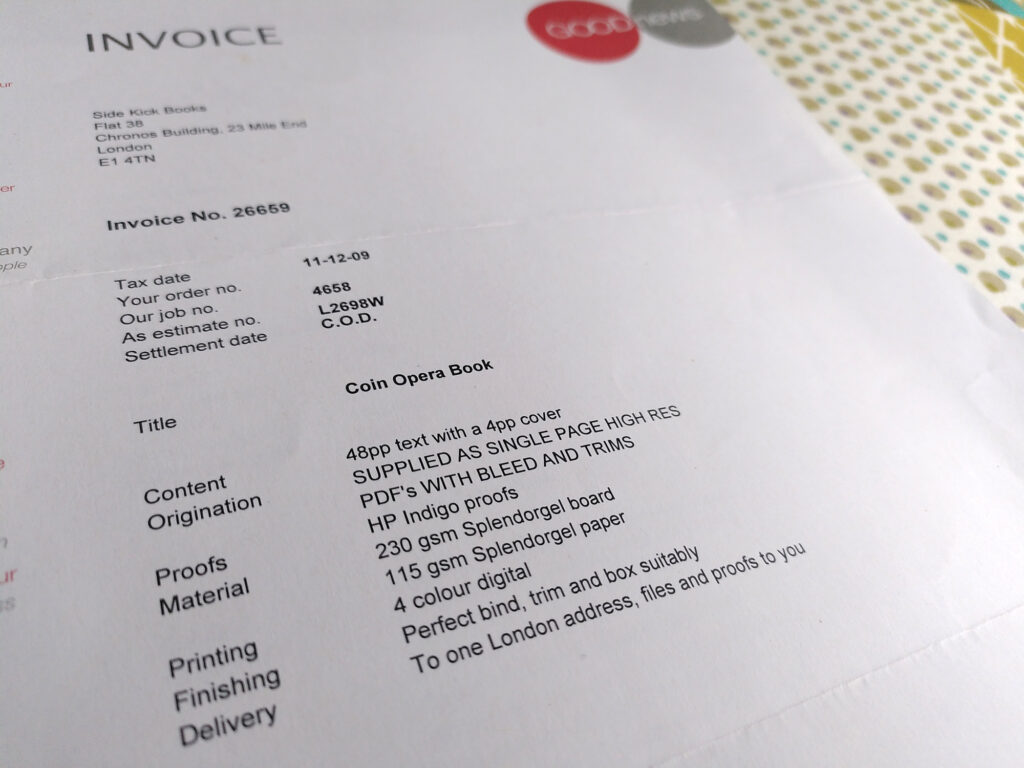 We’ve been (quietly) celebrating our 15th anniversary this year, via some£15deals combining recent titles with items from our backlist. Meanwhile, a sudden spate of organisational enthusiasm uncovered some items from right back at the start of the Sidekick journey. Here, for instance, is the first invoice we ever received from a printer, for our micro-anthology Coin Opera, at £517 for 200 copies – a little steeper than we’d hoped, but typical of a short print run with thick gloss paper: